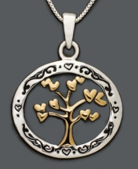 Surround yourself with the love of your family. Engraved circular sterling silver pendant features a 14k gold over sterling silver tree at center with heart leaves. Approximate length: 18 inches. Approximate drop: 1 inch.