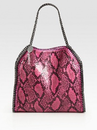An exotic, faux python style with shiny link chain trim that follows the brand's vegetarian initiatives.