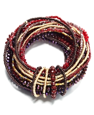 Intricately intertwined. A complex array of beading (including bugle beads, seed beads and glass rondelles) embellishes this stylish stretch bracelet from c.A.K.e. by Ali Khan. Featuring a rich fall palette of reds and browns, the stretch design lets it slip on and off with ease. Approximate diameter: 2-1/4 inches.