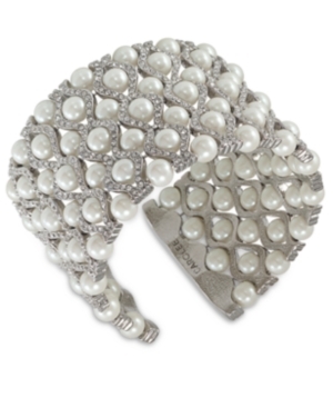 Light up the night. Carolee's wide cuff bracelet is crafted from silver-tone mixed metal with glass pearls and glass crystal accents adding a lustrous touch. Approximate diameter: 2-1/4 inches.