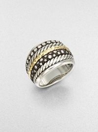 From the Midnight Melange Collection. This beautiful multi-band design features rows of dazzling diamonds in blackened sterling silver, radiant hammered 18k gold and cabled sterling silver.