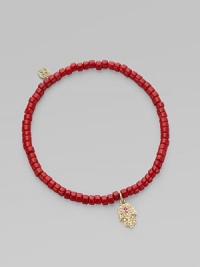 The hamsa, a traditional protective amulet, is encrusted with diamonds and accented with one ruby as it hangs from a stretchy strand of richly colored coral beads.