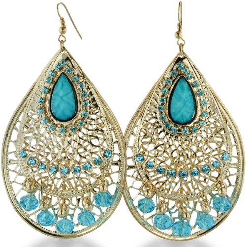 Gold Tone Turquoise Blue Crystal 3.5 Inch Dangle Drop Chandelier Earrings