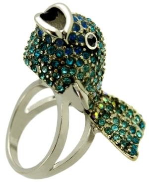 Make a splash with this conversation starter. Aqua and capri-blue crystals adorn GUESS's playful catfish ring. Set in imitation rhodium-plated mixed metal. Size 7.
