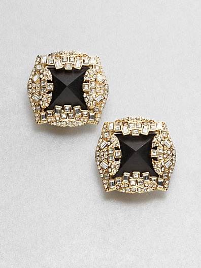 From the Lucite Teatro Moderne Collection. In the center, pyramids of hand-painted, hand-sculpted Lucite, richly framed by Swarovski crystals in a gleaming goldtone setting.