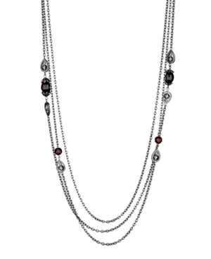 Long story. From the Crystal Elegance Collection, T Tahari's triple strand long necklace features subtle embellishment in the form of red and black crystal accents. Crafted in hematite tone mixed metal, it's nickel free for sensitive skin. Approximate length: 30 inches + 3-inch extender.