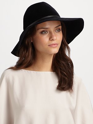 Asymmetric wide brim hat with leather and metallic O'Ring trim.