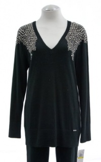 Michael Kors Black Cotton Blend V-Neck Sweater with Silver Stud Accents Medium