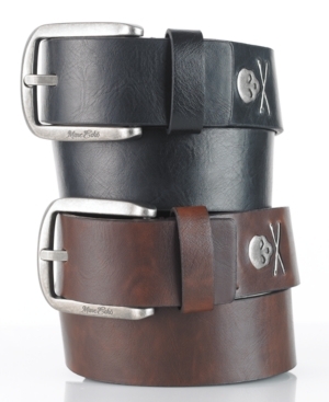 With a little bit of danger in the details, this skull and bones belt from Marc Ecko gives your outfit some rebel attitude.