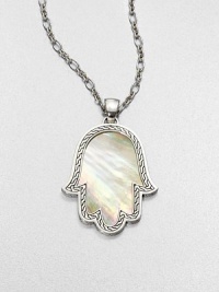A mano di fatima pendant in iridescent mother-of-pearl surrounded by intricately designed sterling silver on a link chain.