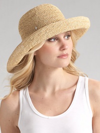 Packable wide brim style is hand-crocheted of natural raffia with an adjustable sizing cord.