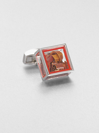 Inspired by the tale of Pandora's box in Greek mythology and featuring the Tateossian signature element of surprise, this glass-box cuff link holds chili flakes.
