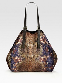 A colorful python print on durable canvas with luxurious leather accents.