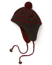 Paul Smith offers up this earthy striped hat, accented with a pom pom on top, contrast earflaps and braided ties at the chin.