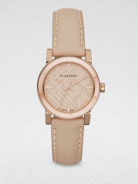 A warm timepiece with a iconic, check stamped dial and a luxurious leather strap.
