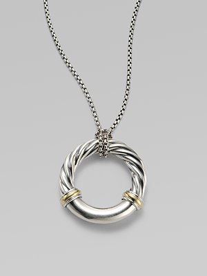 From the Metro Collection. A sleek, sophisticated circle, combining smooth and cabled sterling silver with accents of 18k gold, hangs from a richly textured silver chain and bale.