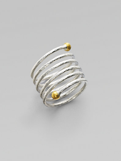 From the Spring Collection. A spiral of hammered sterling silver is richly capped with 24k yellow gold spheres.