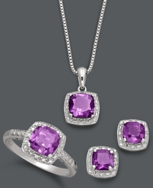 Poignant in purple. This stunning jewelry set highlights cushion-cut amethyst gemstones (4-1/3 ct. t.w.) in a sterling silver setting. Set includes a pendant, a ring, and a pair of stud earrings. Approximate necklace length: 18 inches. Approximate drop: 1/2 inch. Approximate earring diameter: 1/4 inch. Ring size 7.