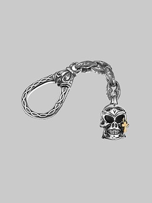 Skull-motif charm with a solid 18k gold cross accent on an engraved sterling silver clasp.