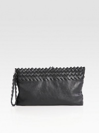This supple, pebbled leather design is accented with a woven leather trim and wristlet strap.